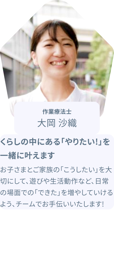 理学療法士(PT)・作業療法士(OT)・言語聴覚士(ST)などお子さまの発達に関する専門職が支援を行います。