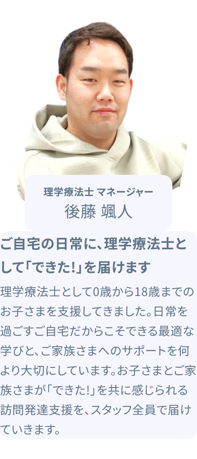 お子さまから自発的な声かけが増え、親子のやり取りがスムーズに。お母さまも「子どもとの関わりが楽しくなった」と笑顔で話されるようになりました。